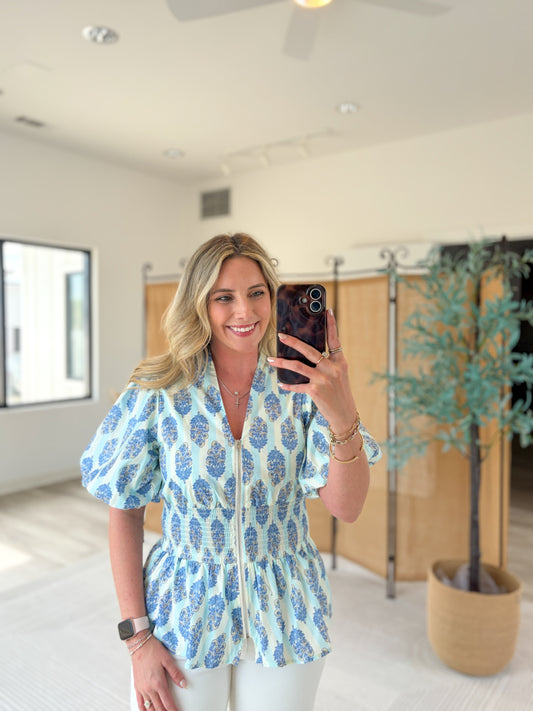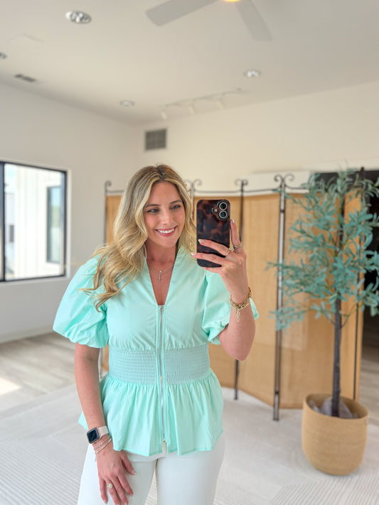 Zip-Up Puff Sleeve Blouse